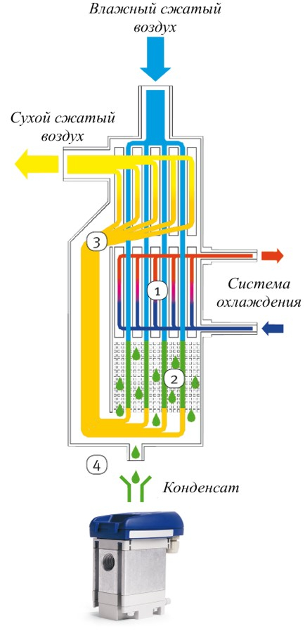 3. Перед выходом из осушителя выходящий осушенный сжатый воздух снова нагревается, забирая теплоту от входящего влажного сжатого воздуха. При этом относительная влажность воздуха значительно падает.