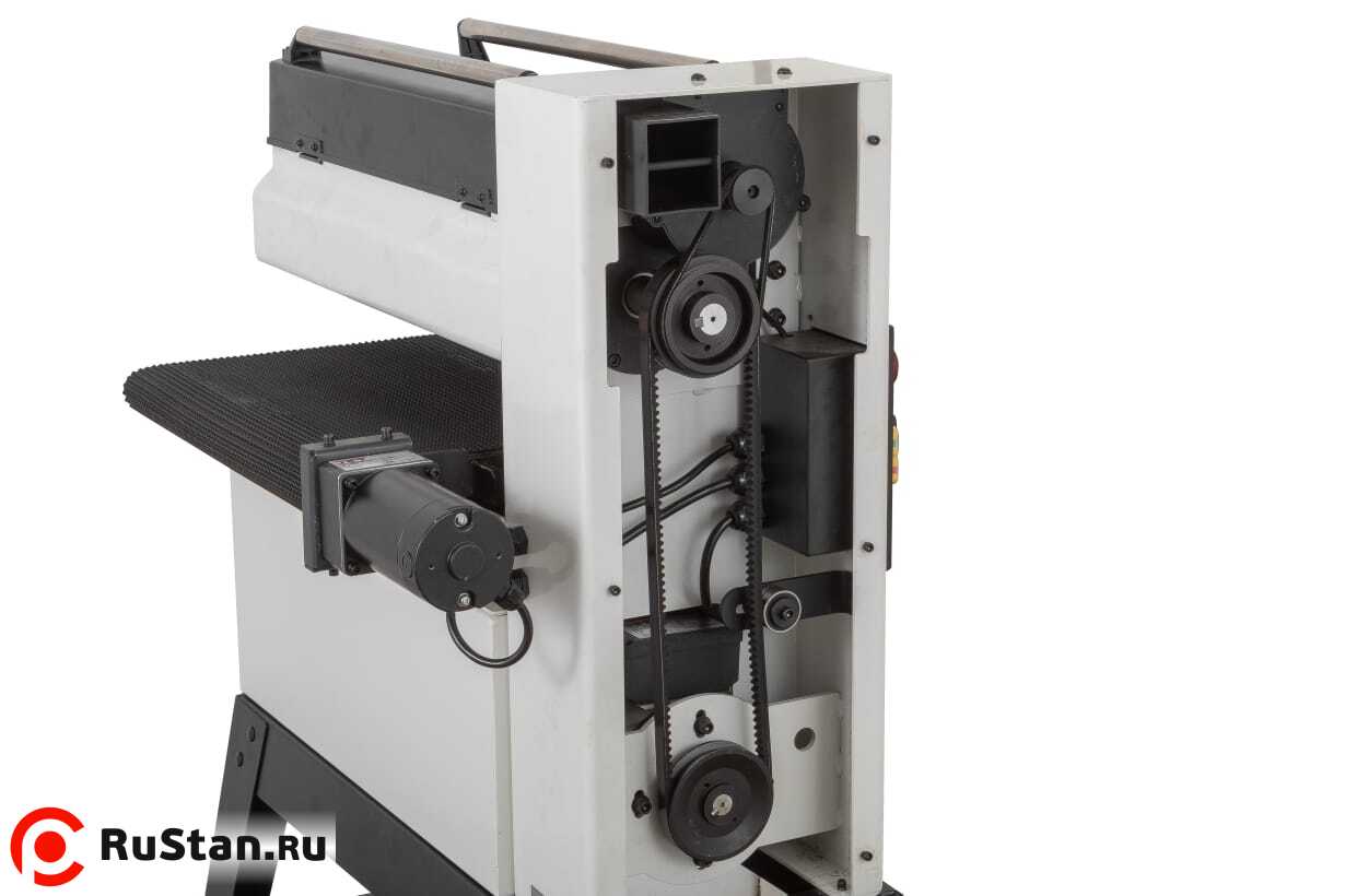 Запущенный двигатель, через ременную передачу вращает шлифовальный барабан с намотанной на него шлифовальной лентой. Второй мотор двигает транспортер в направлении барабана с выбранной скоростью. Заготовка, уложенная на подающий транспортер, перемещается через рабочую зону. В рабочей зоне ее подхватывает подающий ролик и прижимает к ленте. Последовательно вступает в работу шлиф. вал и после него принимающий ролик. Таким образом во время основной работы заготовка плотно прижата к ленте транспортера, а вал вращается на встречу и снимает с нее запланированную толщину. Скорость движения заготовки можно менять от 0,5 до 4-х метров в минуту. Оператор вручную укладывает заготовку на рабочий стол и вручную принимает ее с противоположной стороны. «Чище» шлифовка происходит в направлении волокон, но в JWDS-460-M можно работать и поперек волокон, и по диагонали. Обработка в барабанных шлифовщиках считается финишной и требует только небольшой чистовой дошлифовки.