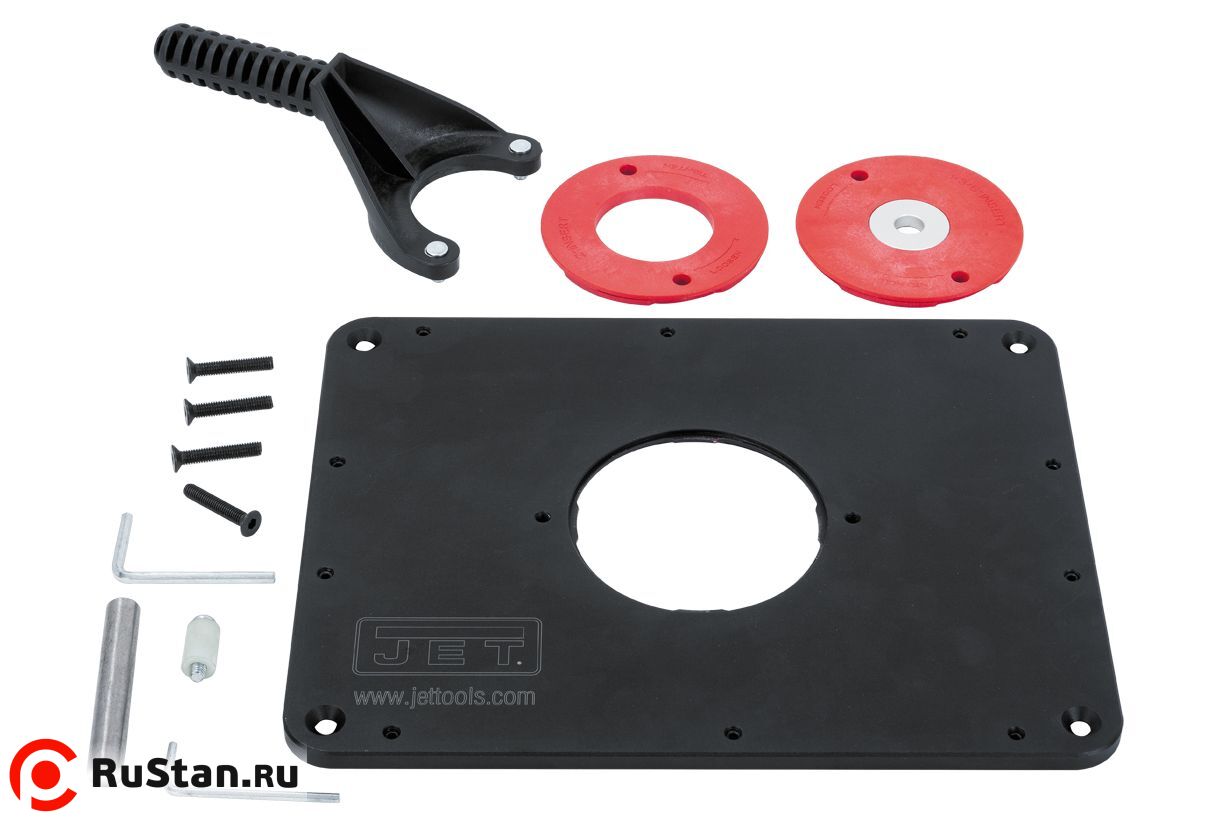 Прочная и жесткая дюралевая пластина 298х235х10 мм для крепления фрезера и установки в отверстие универсального чугунного фрезерного стола Jet 98600W или другого подходящего. Может использоваться для фиксации любых моделей ручных фрезеров – крепежные отверстия сверлят с обратной стороны «по месту». Для облегчения монтажа пластина оборудована юстировочными винтами по периметру, предназначенными для выравнивания плоскости со столом станка. С точки зрения удобства последующей эксплуатации оптимальны модели ручных фрезеров, оснащенные системой микролифта и блокировкой вала со стороны подошвы, например Triton TRA001.