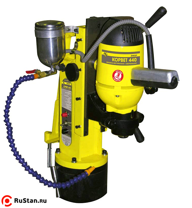 Вертикальный сверлильный станок «Корвет 440» на магнитной подошве незаменим при монтаже различных металлоконструкций, когда требуется сверление относительно больших диаметров. Эти станки достаточно мобильные и позволяют сверлить крепежные отверстия непосредственно на месте монтажа. Надежное крепления станка на металлоконструкции осуществляется за счет электромагнита.