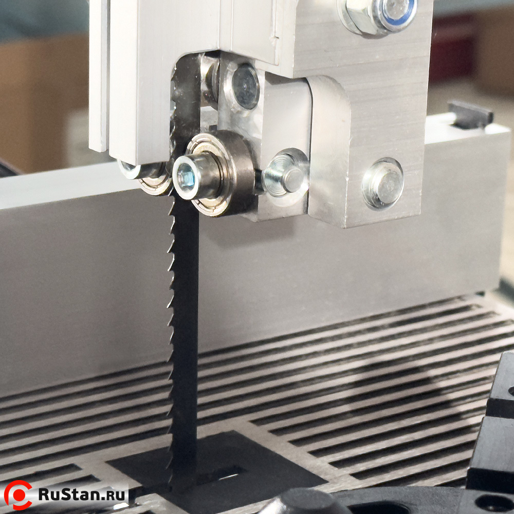 Вылет верхнего блока направляющих подшипников устанавливается в зависимости от толщины разрезаемого материала. Для получения точного и качественного среза, расстояние между верхним блоком направляющих подшипников и обрабатываемым материалом должен быть минимальным, но при этом заготовка должна свободно перемещаться на столе (рекомендуемый зазор между верхним блоком направляющих и заготовкой 3 – 5 мм)