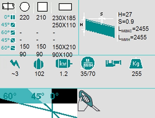 Наибольший размер отрезаемой заготовки прямоугольного сечения (при угле реза 0 град.), мм. 230 х 185