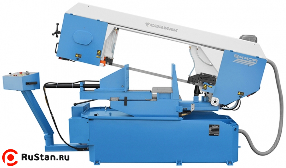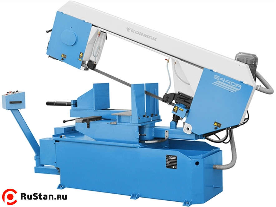 Полуавтоматический ленточнопильный станок CORMAK S-440R. Консоль пилы изготовлена из единого чугунного литья, наряду с применением режущей ленты 34 мм позволяет в полной мере выполнять резку как профилей, так и сплошных материалов. В станке применены гидравлические тиски и гидравлическое опускание и подъем стрелы.
