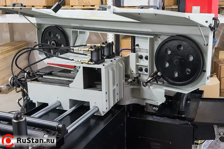 Станок оснащен гидравлическими тисками с возможностью быстрого зажима заготовок. Помимо гидравлического зажатия, тиски имеют механический ход. На основной панели расположены: цветной сенсорный дисплей, с помощью которого можно задать программу и отслеживать процесс пиления, регулятор скорости опускания пилы и кнопка аварийного останова.