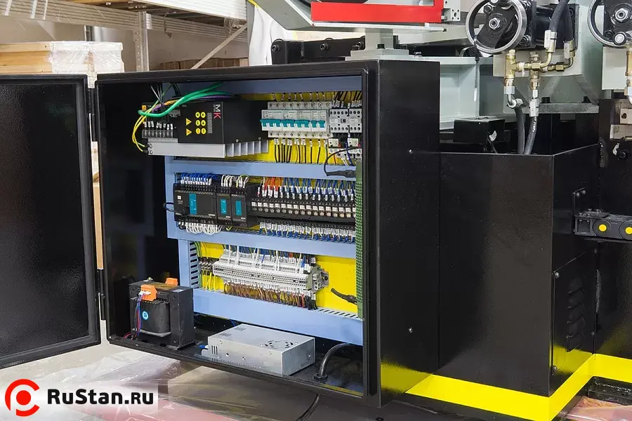 Панель управления выведена консолью к станку, для удобства оператора. Длина подачи заготовки контролируется автоматически c ЧПУ (СNC). ЧПУ станка строится на PLC контроллере. Сенсорный дисплей управления.