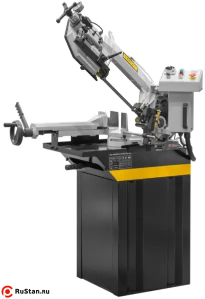 Модель имеет быстрорегулируемые тиски для резки под углом, поворачивается рама, а не заготовка. Тиски с системой быстрого отвода ускоряют процесс смены заготовки (ускоренный отвод подвижной губки происходит без вращения маховика). Зажим заготовки осуществляется тисками вручную, подача заготовки - также вручную. Наличие системы СОЖ в стандартной комплектации – позволяет добиться высокой производительности.