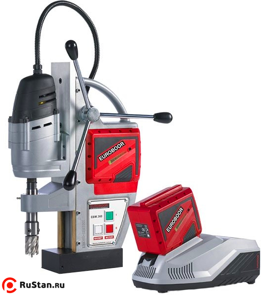 Аккумуляторный сверлильный станок на магнитном основании EuroBoor EBM.360 - электромагнит и электромотор станка питаются от встроенного аккумулятора. Аккумулятор Lithium-Ion, заряда которого хватает на 300 отверстий. Когда батарея аккумулятора начинает садится, появляются предупреждающие звуковые сигналы. Это мощная и легкая машина подарит Вам 100%-ую мобильность в работе. EBM.360 быстро врезается в конструкционные стали толщиной до 50 мм.