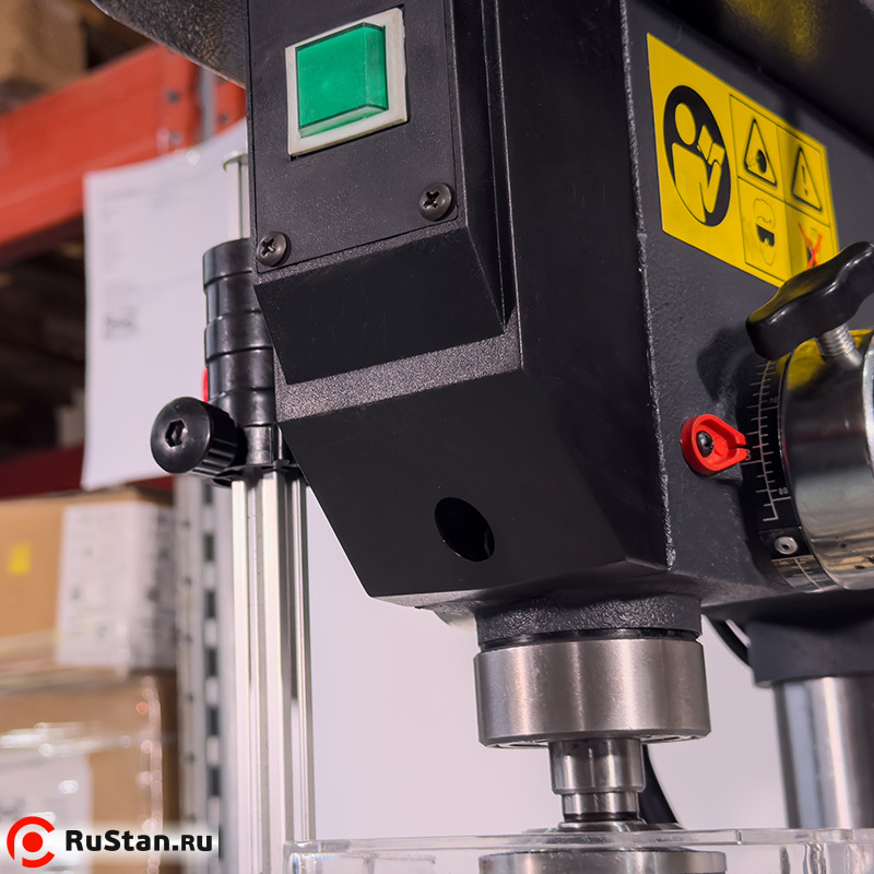 Особенностью представленного оборудования является дополнительная возможность выбора направления вращения шпинделя. Кроме этого, станок снабжен радиальными подшипниками. Существует возможность обработки деталей под различными углами за счет поворота стола с помощью поворотной цапфы (угол поворота — 360 град.), а также наклона стола на 45 градусов. Глубина сверления может регулироваться в зависимости от поставленных задач. Рабочая зона станка — с подсветкой.