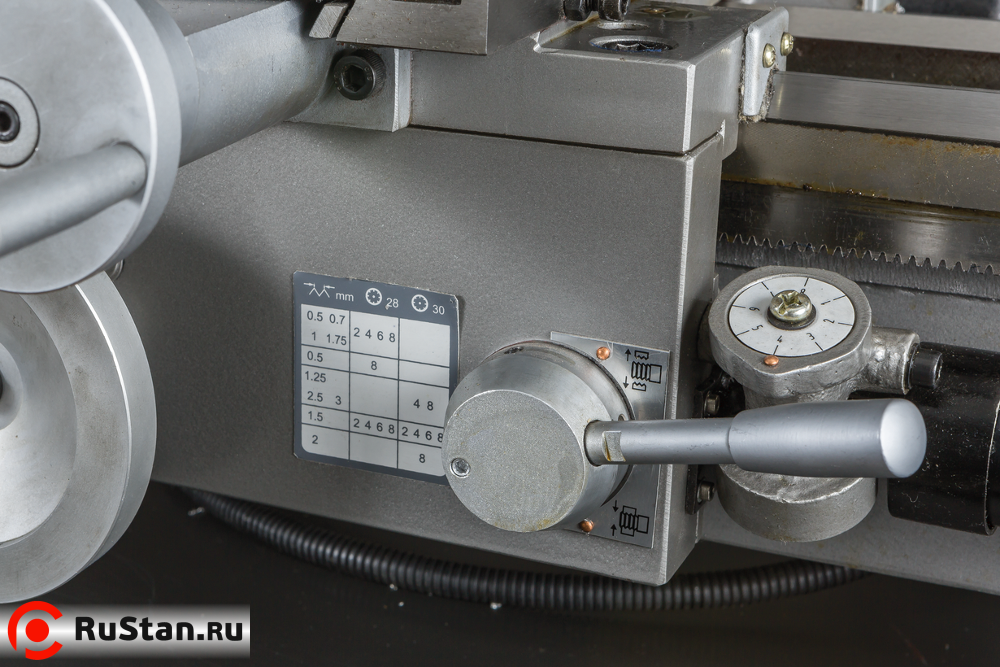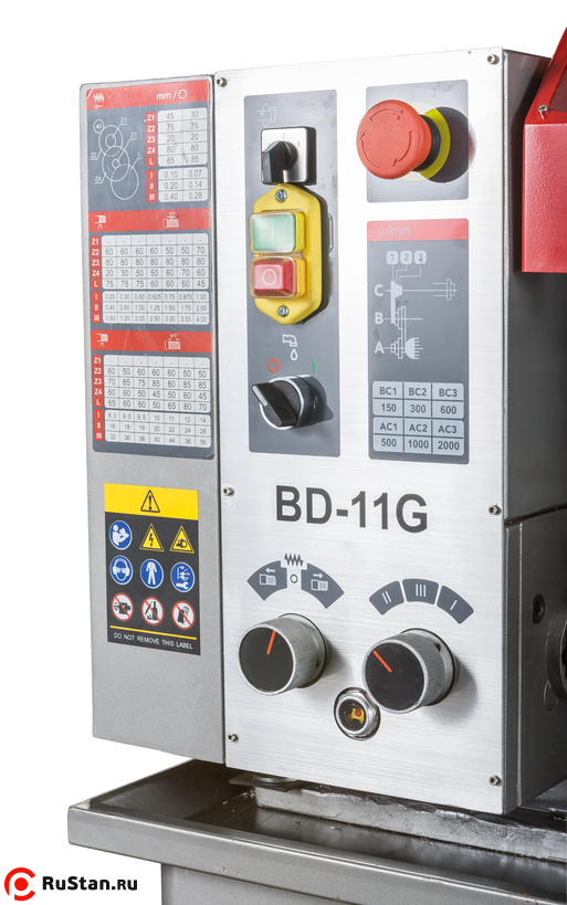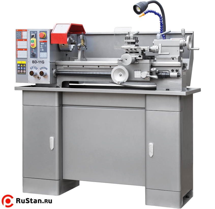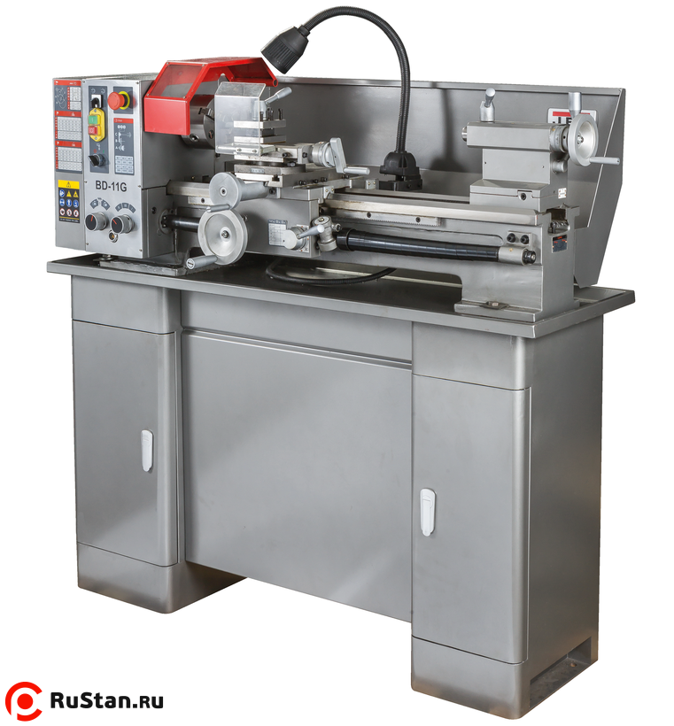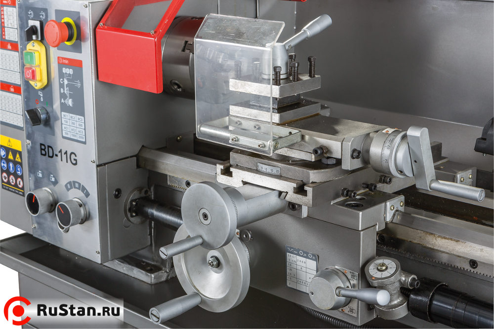 Станок BD-11G способен выполнять все операции токарного станка. На станке предусмотрена возможность нарезание правой и левой резьбы, автоматическая продольная подача суппорта, возможность поворота резцедержки для проточки малых конусов, юстировка задней бабки для проточки больших конусов. На станке установлена коробка подач, 3-х ступенчатая, которая позволяет изменять шаг резьбы или скорость автоматической подачи без замены шестеренок. Все шестерни, установленные на станке, выполнены из металла. Станок поставляется в комплекте с 3-х кулачковым патроном и неподвижным люнетом. Все остальное можно докупить по мере необходимости – это и 4-х кулачковый патрон, и подвижный люнет, и станцию СОЖ, планшайба, резцы и множество других аксессуаров.